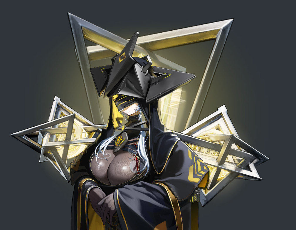 This is the D.E.E.P. agent from the FOOTSTEP, WALK, RUN event. You can see a similar triangle motif appear in the prisms behind her. In fact, they’re three interconnected pyramids, basically a 3D version of the 2D design on Liliweiss’s outfit.