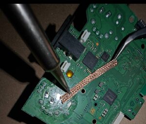 This is where the desoldering iron comes in! Imagine the same process, but both tools are built into one. Not only are you able to heat and melt the solder that you cant to remove, but since the tip of the desoldering iron has a hole, you can cover the solder you want to remove from the top down and remove it instantly with the same tool. You don’t run the risk of the solder cooling as you move your pump in to remove it. It was honestly the best thing ever, because it made the whole repair process 100x easier. I highly recommend getting a desoldering iron if you plan on repairing your controllers, too.