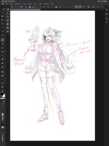 First, I find an artwork I really like. I’ve been playing a lot of Girls’ Frontline and there’s a lot of units in the game that go under the radar. One of my new favorites is APCK9, I really like how she looks and her pose might seem simple at first but there’s a decent line of action as you can see from the orange line I drew.